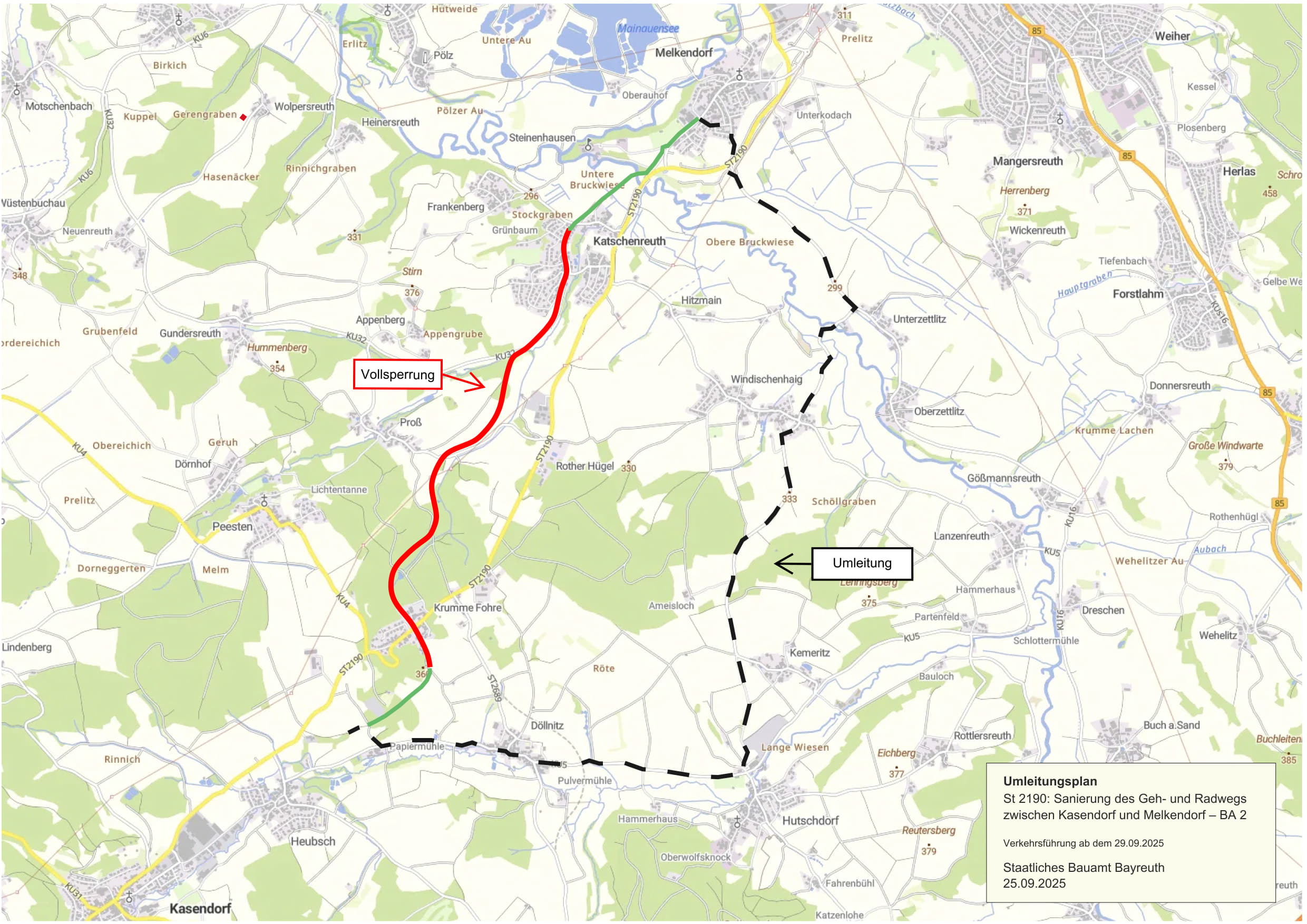 Das Staatliche Bauamt Bayreuth saniert ab dem 29. September 2025 den zweiten Abschnitt des straßenbegleitenden Geh- und Radwegs entlang der St 2190 zwischen Kasendorf und Melkendorf im Landkreis Kulmbach.
