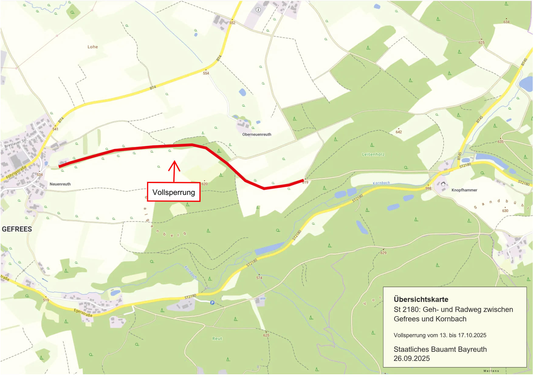 Das Staatliche Bauamt Bayreuth führt vom 13. bis 17. Oktober 2025 Pflegearbeiten an rund 80 Bäumen entlang des neu errichteten Geh- und Radwegs zwischen Gefrees und Kornbach durch.