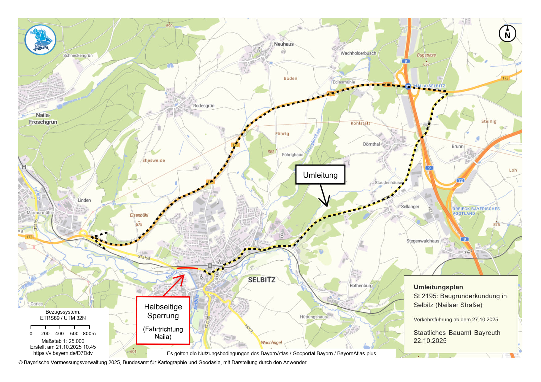 Um die erforderlichen Arbeiten sicher durchführen zu können, ist vom 27. Oktober bis voraussichtlich zum 14. November 2025 eine halbseitige Sperrung eines Abschnitts der Nailaer Straße (St 2195) in Selbitz notwendig.